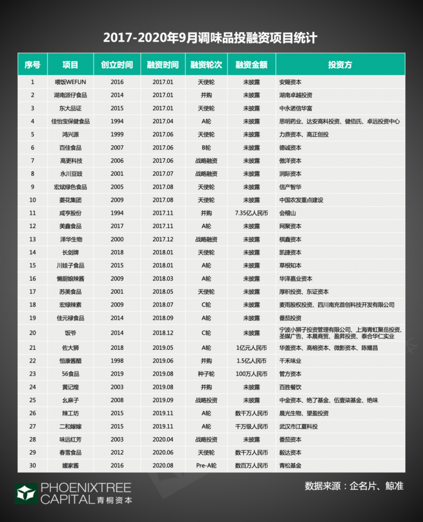 有個(gè)特別的現(xiàn)象,調(diào)味品玩家數(shù)量龐大,資本關(guān)注度亦高,但最終投資的項(xiàng)目量并不多。這主要因?yàn)榉蠙C(jī)構(gòu)投資邏輯的標(biāo)的有限,資本看調(diào)味品項(xiàng)目,重點(diǎn)會考量渠道、供應(yīng)鏈能力。