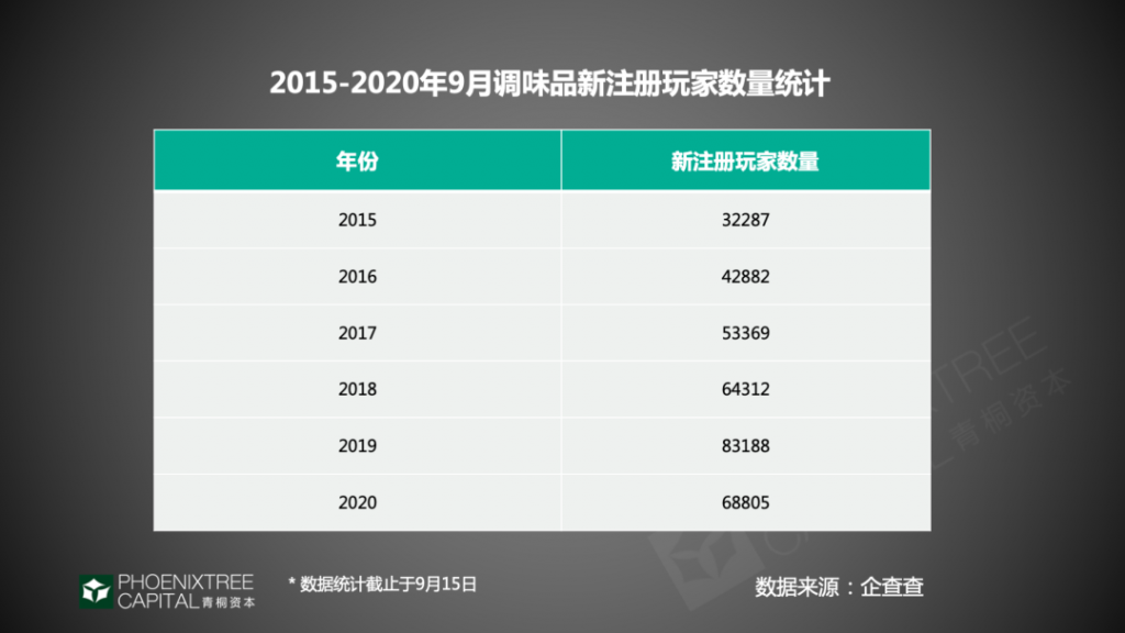 同時(shí),賽道新玩家數(shù)量逐年上漲,據(jù)企查查數(shù)據(jù),2020年1-9月,調(diào)味品新注冊企業(yè)共68805家,2019年為83188家,已是2015年的2.5倍。
