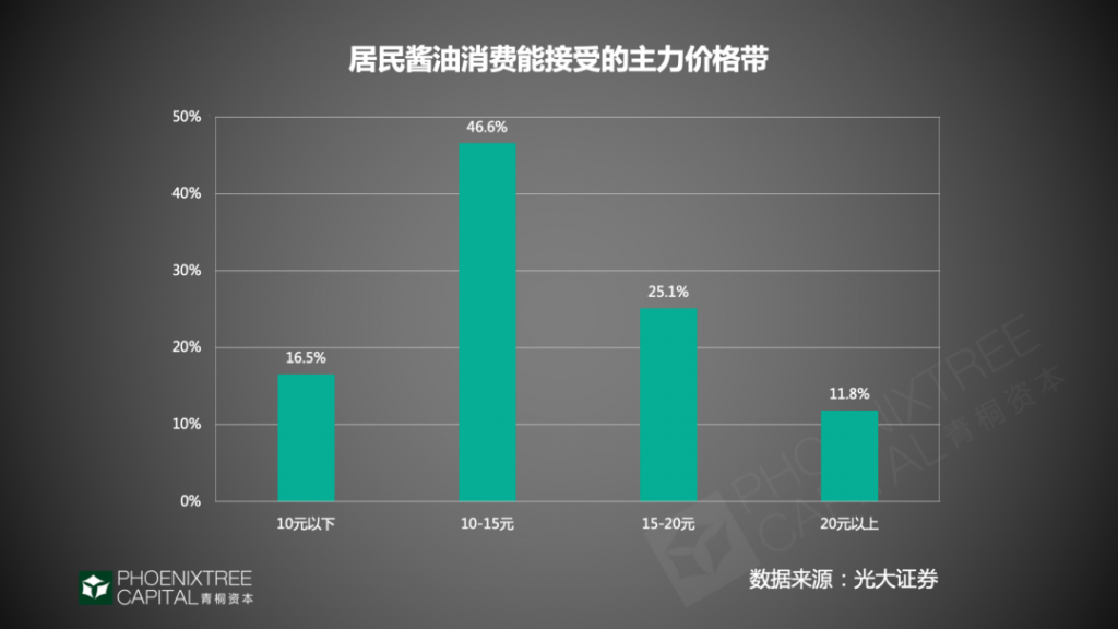 其次,產(chǎn)品價(jià)格不斷升級,根據(jù)Euromonitor數(shù)據(jù),2019年我國調(diào)味品行業(yè)平均零售價(jià)為19.4元/千克,2014-2019年逐年上漲,復(fù)合增長率為3.5%。另據(jù)光大證券,國內(nèi)居民購買醬油的主力價(jià)格帶,也從10元以下,上升到10-15元,占46.6%。