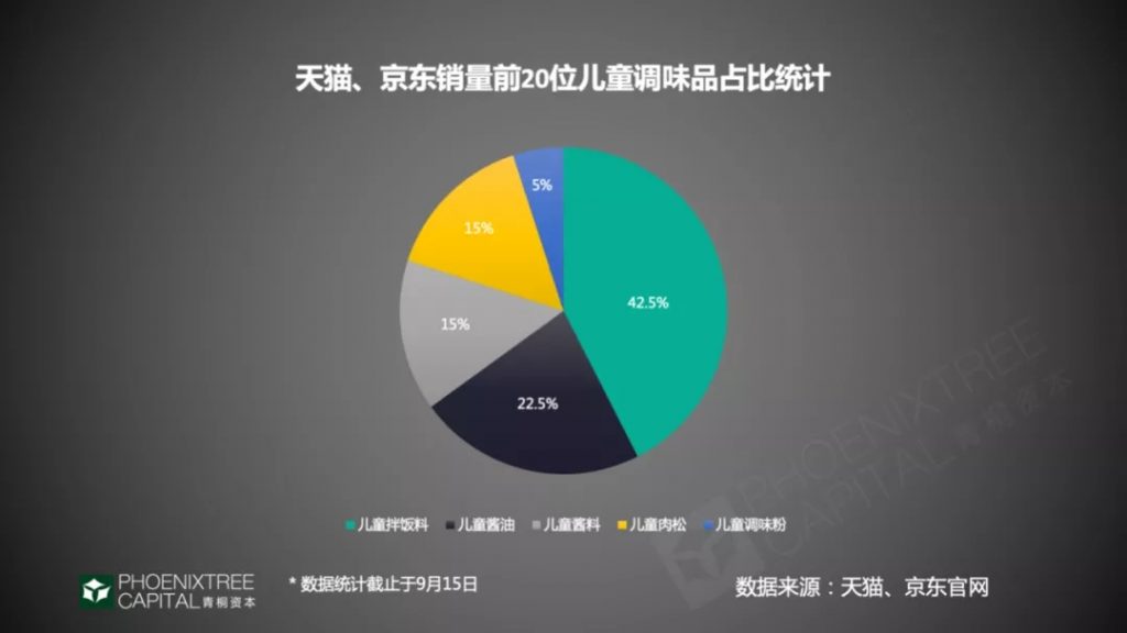 從品類來看,國產(chǎn)調(diào)味品居多,兒童拌飯料、兒童醬油最受歡迎。據(jù)智研咨詢數(shù)據(jù),國產(chǎn)兒童調(diào)味品占近70%。青桐資本統(tǒng)計(jì)天貓、京東數(shù)據(jù)發(fā)現(xiàn),兩大平臺銷量前20位的兒童調(diào)味品中,兒童拌飯料占42.5%,兒童醬油占22.5%。