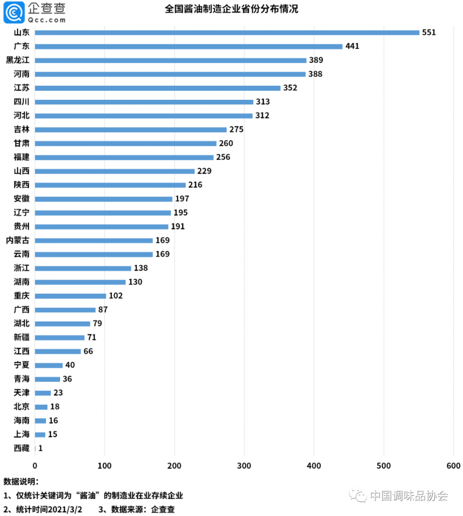 ? ? ? 醬油制造企業(yè)省份分布上,山東省擁有的醬油制造企業(yè)最多,達(dá)551家,廣東、黑龍江次之。
