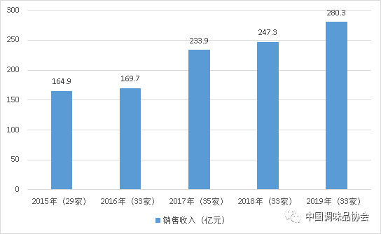 ? ? ? 2015-2019年百?gòu)?qiáng)企業(yè)醬油產(chǎn)業(yè)銷售收入分別為:164.9億元、169.7億元、233.9億元、247.3億元、280.3億元。