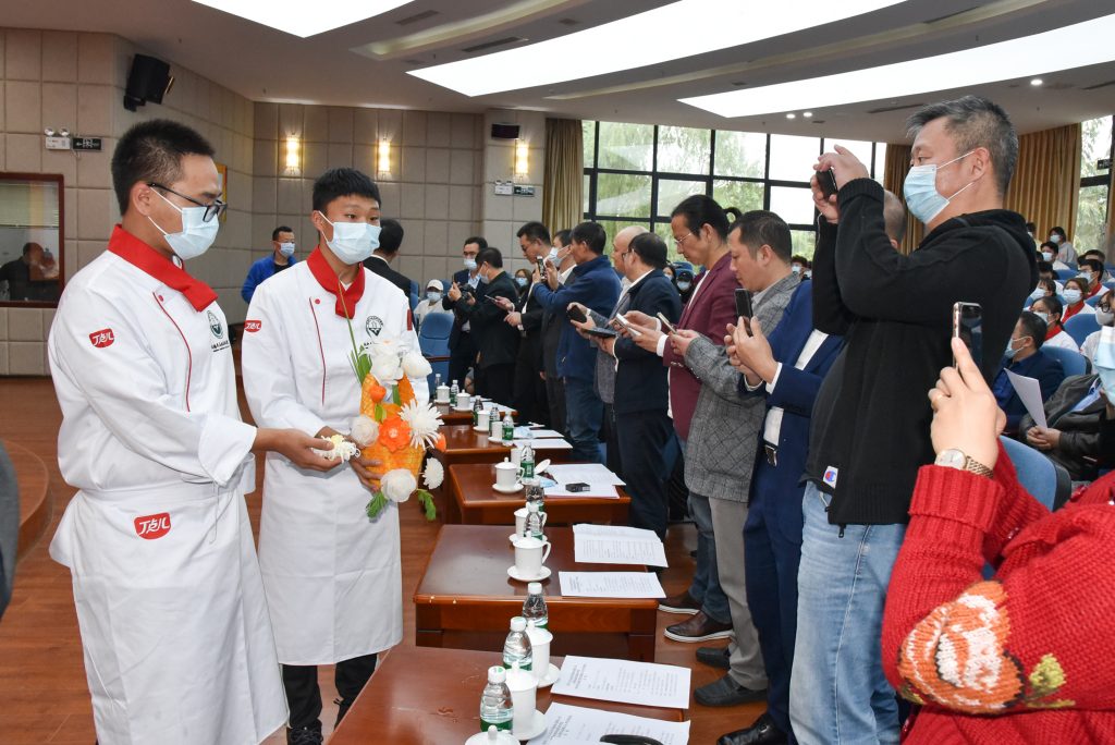? ? ? ?隨后,新生代表在現(xiàn)場進(jìn)行了刀工、裱花、雕刻等烹飪相關(guān)技藝展示,熟練的操作和精致的作品吸引了在場所有人員目光,并紛紛拍照留念。