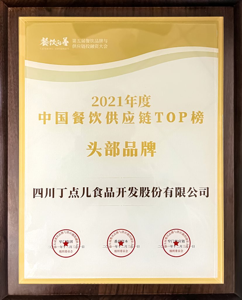? ? ? ? 在此次評選活動中,丁點兒股份獲得各界評委的一致認可,從參評的3000+個同類供應商品牌中脫穎而出,獲得“2021年度中國餐飲供應鏈TOP榜頭部品牌”稱號。此項榮譽是對丁點兒股份在中國餐飲行業(yè)做出卓越貢獻的高度肯定,也是對企業(yè)發(fā)展前景有著更高的期望。