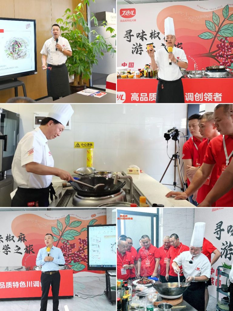 中國(guó)烹飪大師劉全剛、舒國(guó)重、劉凌峰、朱建中、曹曉軍等運(yùn)用丁點(diǎn)兒干鍋醬、金湯酸菜醬、藤椒油、椒麻雞汁及麻得倒紅花椒油等產(chǎn)品現(xiàn)場(chǎng)演繹特色菜品,幫助大家深化產(chǎn)品理解和運(yùn)用。大廚們以分組抽盲盒食材的形式進(jìn)行菜品制作挑戰(zhàn),在實(shí)操中發(fā)掘丁點(diǎn)兒高品質(zhì)特色川調(diào)獨(dú)特的風(fēng)味魅力。??