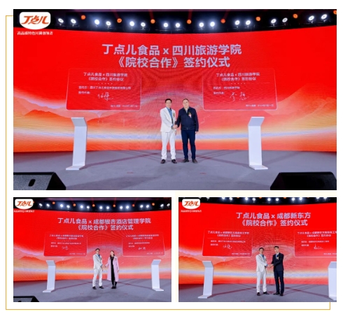 同時丁點兒食品與四川旅游學院、成都銀杏酒店管理學院、成都新東方高級技工學校進行了《院校合作》簽約,通過不斷深化校企合作,助推川菜產業(yè)行穩(wěn)致遠。四川旅游學院烹飪學院院長李想表示,通過科研項目、烹飪比賽等形式共同為川菜技能人才培養(yǎng)和高質量發(fā)展作出貢獻。