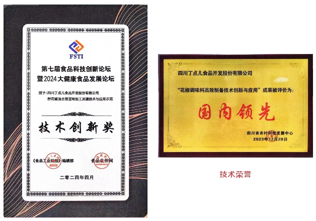 依托行業(yè)領(lǐng)先技術(shù)創(chuàng)新體系,丁點兒食品不斷取得重大行業(yè)技術(shù)突破,獲授權(quán)國家專利50余項。其中,“花椒調(diào)味料高效制備技術(shù)創(chuàng)新與應(yīng)用”被評為國內(nèi)領(lǐng)先,“鮮花椒油去苦澀味加工關(guān)鍵技術(shù)與應(yīng)用示范”獲“技術(shù)創(chuàng)新獎”,充分彰顯了企業(yè)在食品科技領(lǐng)域的創(chuàng)新實力和核心競爭力。