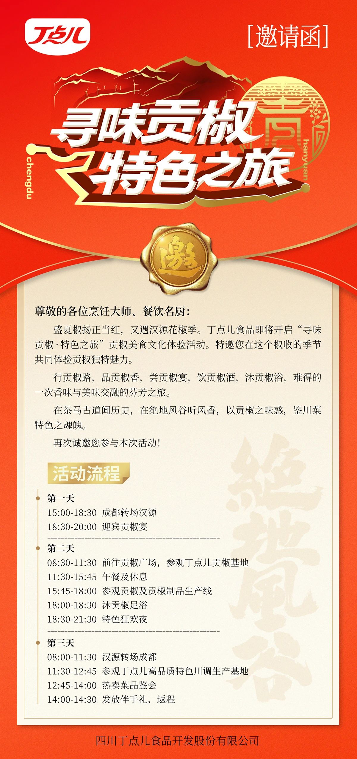 8月至9月中旬,丁點(diǎn)兒食品誠邀全國各地餐飲烹飪大師、名廚和餐飲老板參與2024“尋味貢椒·特色之旅”營銷體驗(yàn)活動(dòng),我們?cè)凇按ú酥恰臂迹柏暯分l(xiāng)”漢源等著您!我們將持續(xù)報(bào)道,敬請(qǐng)關(guān)注。