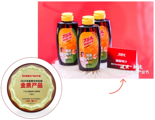 在風(fēng)向標(biāo)產(chǎn)品(春季)全球發(fā)布會(huì)環(huán)節(jié),丁點(diǎn)兒椒麻雞汁隆重亮相,成為全場(chǎng)焦點(diǎn),并以出色味型、獨(dú)特風(fēng)味贏得組委會(huì)和市場(chǎng)認(rèn)可,斬獲“2025年度餐飲供應(yīng)鏈金質(zhì)產(chǎn)品”榮譽(yù)稱號(hào)。