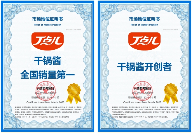 尚普咨詢集團(tuán)是中國最早成立的專業(yè)市場(chǎng)研究公司之一。其通過行業(yè)專家和企業(yè)調(diào)研,對(duì)比中國大陸(含22個(gè)省、5個(gè)自治區(qū)、4個(gè)直轄市)范圍內(nèi),全渠道市場(chǎng)、各干鍋醬產(chǎn)品上市時(shí)間與創(chuàng)新情況,從我國干鍋醬行業(yè)起源統(tǒng)計(jì)至2024年12月31日,得出丁點(diǎn)兒為“干鍋醬開創(chuàng)者”的認(rèn)證。同時(shí)根據(jù)全渠道市場(chǎng),統(tǒng)計(jì)了2024年1月1日至2024年12月31日各干鍋醬品牌相關(guān)產(chǎn)品銷量情況,得出丁點(diǎn)兒“干鍋醬全國銷量第一”的認(rèn)證。