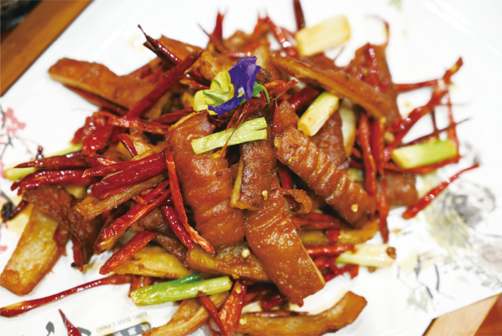 3.起鍋燒油,將鹵肥腸、姜、蒜下鍋焗香,再下入干海椒絲炒至煳辣香味,加入芹菜節(jié)、干鍋醬、椒麻雞汁、麻得倒純萃花椒油,然后調(diào)為大火翻炒入味后起鍋裝盤,撒上芝麻即可。