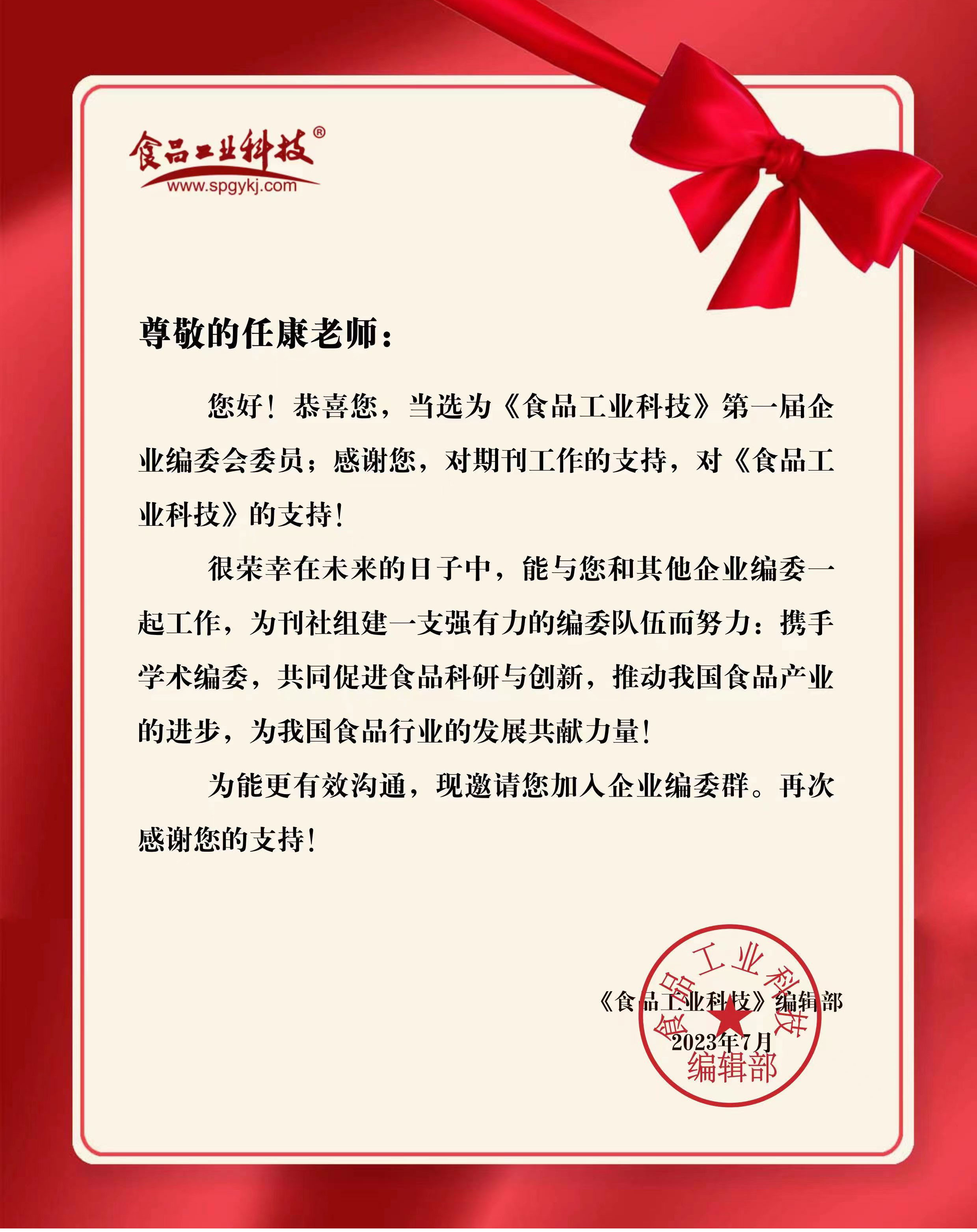 喜報(bào)!任康董事長(zhǎng)榮獲《食品工業(yè)科技》年度“優(yōu)秀企業(yè)編委”表彰